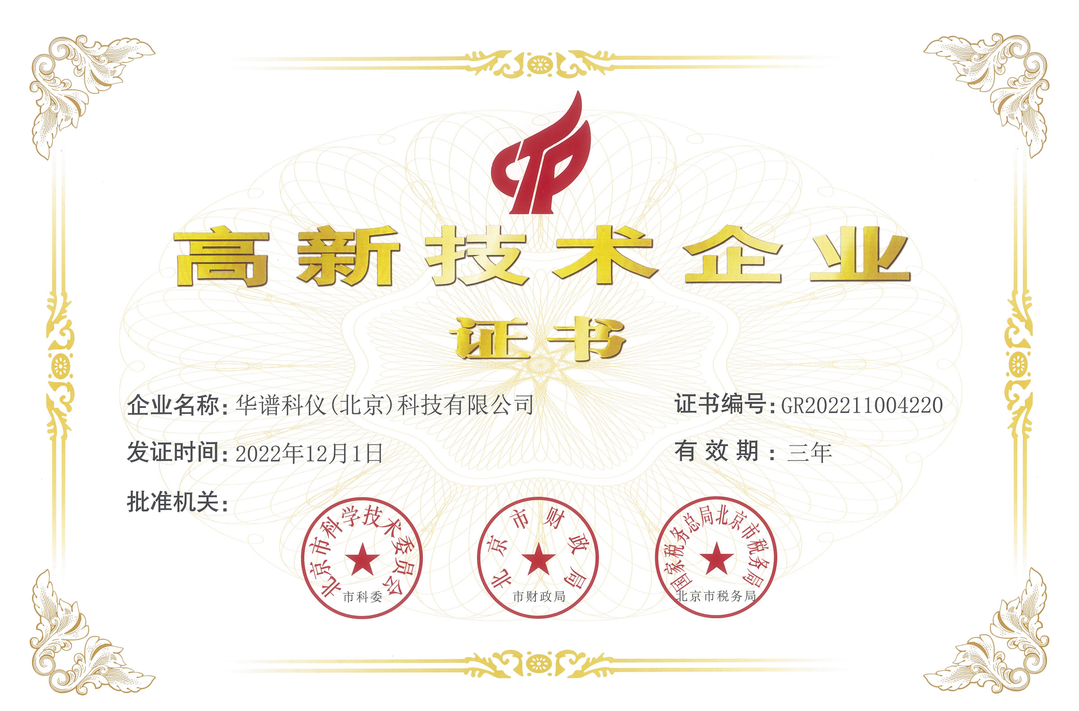 近日,華譜科儀(北京)科技有限公司正式被認定為國家高新技術企業,這意味著華譜科儀在創新研發、成果轉化、核心自主知識產權、企業經營管理和企業社會責任等方面已獲得國家相關部門的認可。