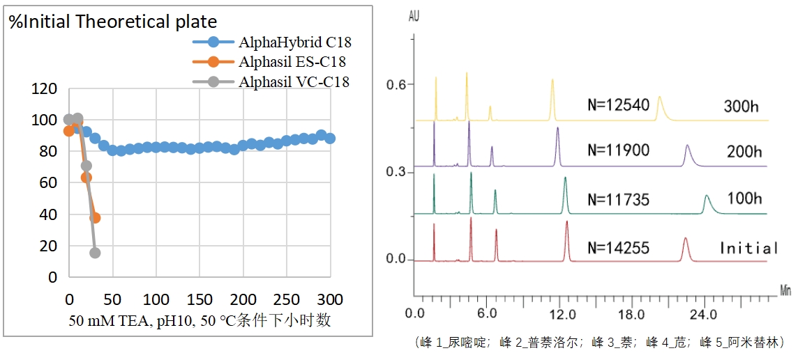 在加速pH穩定性測試中,AlphaHybrid C18在50 mM的三乙胺(pH=10)、柱溫50℃的條件下共經過300 h,柱效依然保持在80%以上。