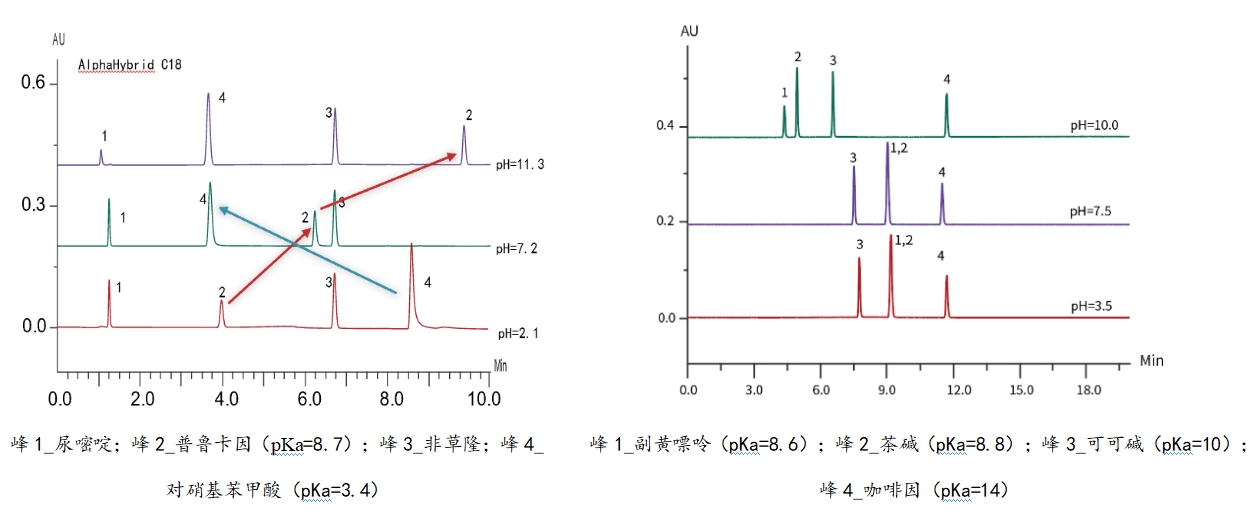 pH 1~12的使用范圍,適用于多種分析方法和條件,用戶可根據實驗需求靈活調整,滿足不同樣品的分析需求。例如,在咖啡因及其代謝物的分析中,當pH處在低-中等階段時,副黃嘌呤和茶堿由于二者的相似性而難以分開,而當pH提到10時,二者可以清晰區分。