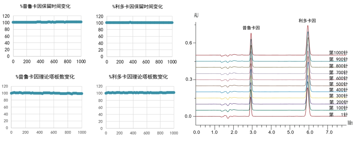 高性能的雜化顆粒與優化的結構設計,使得AlphaHybrid C18具有突出的耐用性,連續進樣1000針,普魯卡因與利多卡因的保留時間及理論塔板數幾乎保持初始狀態,說明AlphaHybrid C18能夠長時間保持穩定的分離效果,為用戶帶來更高的性價比。