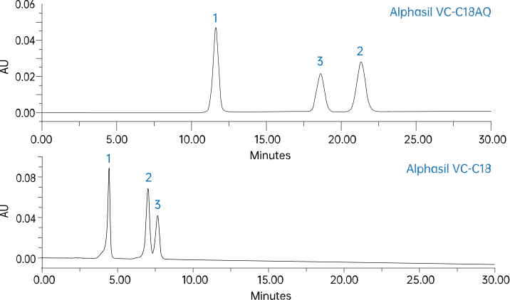 Alphasil VC-C18AQ色譜柱通過內嵌的極性基團帶來的極性作用力,增強了極性化合物的保留并改善了極性選擇性。