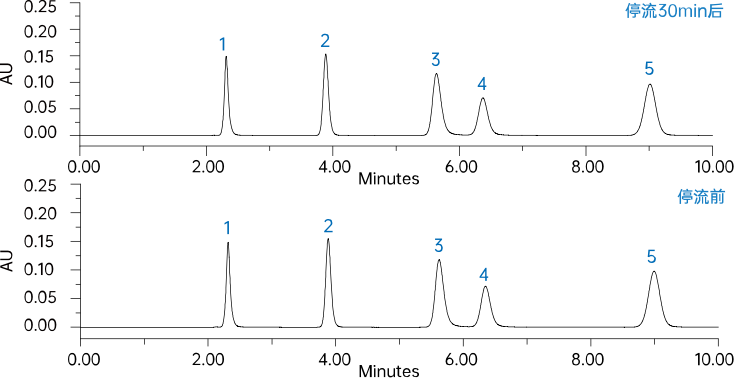 常規C18色譜柱通常在水相超過95%時,會發生鍵合相的疏水塌陷,從而失去對化合物的保留。Alphasil VC-C18AQ色譜柱通過在鍵合相中嵌入極性基團,改善了100%純水相條件下的表面浸潤性,拓展了方法開發的靈活性。在停流速測試中,5種極性化合物的保留時間不發生改變。