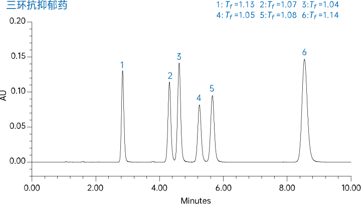 在酸性色譜條件下,測(cè)試抗組胺藥和三環(huán)抗抑郁藥,均表現(xiàn)出出色的峰形。